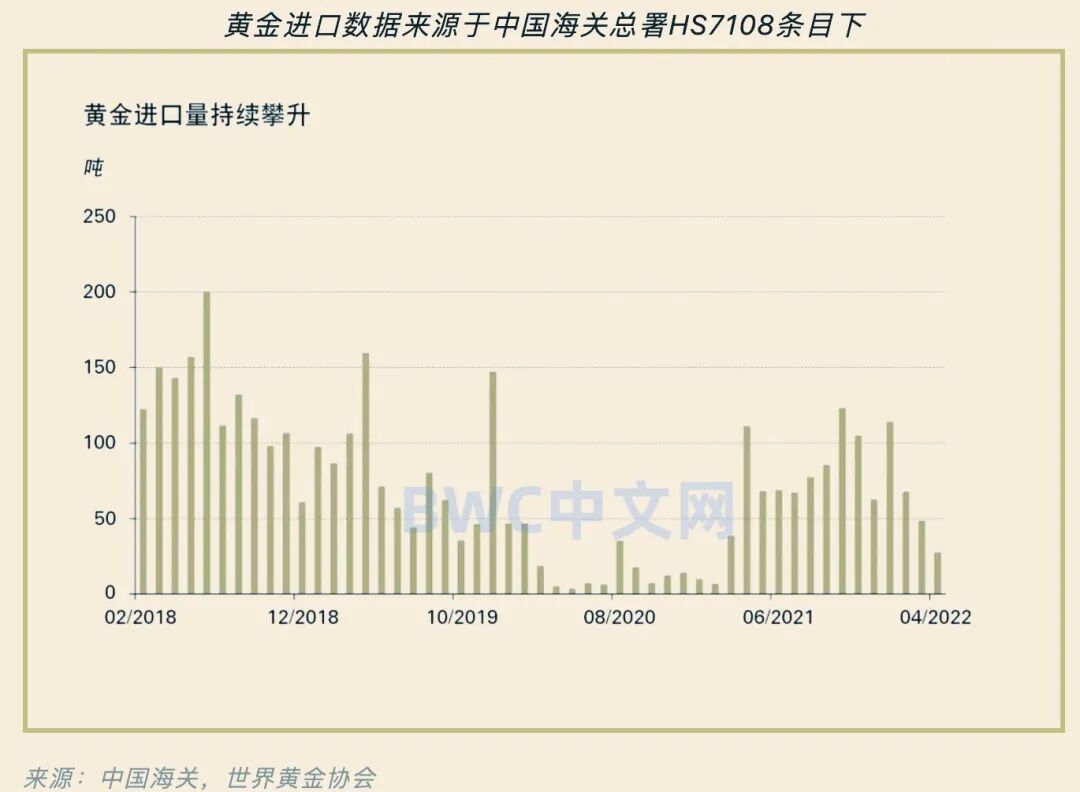 因为,无论是进口、开采还是回收黄金,大部分进入中国的黄金都经过上海黄金交易所(SGE),因SGE是中国黄金市场的核心,因此,对SGE黄金提取的分析将为中国的真实黄金规模和需求提供(请参考下图)。