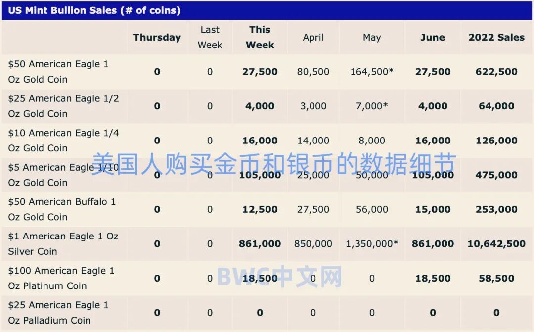 据美国铸币局在7月2日最新公布的数据显示(具体细节请参考下图),2022年1月至6月,鹰金币销售了73.35万盎司,比去年同期高出12.3%,更是接近于2020全年的销售额,这也是延续了2021年120万盎司销量后的又一次强劲表现。另外,鹰银币的销量更是高达1064.2万盎司。