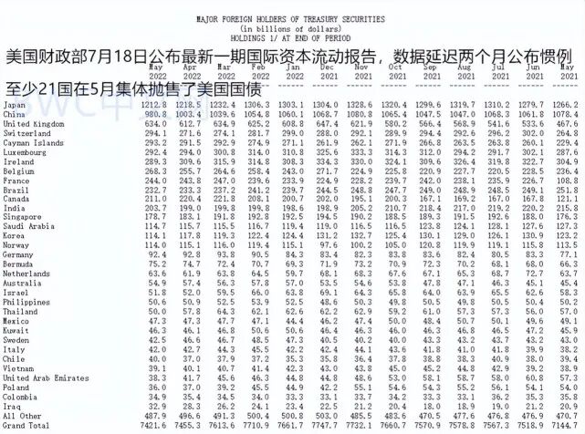 而据美国财政部7月18日公布的最新一期国际资本流动报告TIC显示,该数据会有两个月的滞后期,全球至少21个国家在5月不约而同地抛售了美国国债。例如,作为美债最大海外持有者的日本5月抛售了57亿美元的美国国债,自今年3月以来,日本已连续三个月抛售了美国国债,累计抛售规模高达935亿美元的美国国债,目前日本持仓1.21万亿美元。美国金融网站Zerohedge称,日本正在引领美债抛售潮,美债珍珠港现象似乎正在发生。