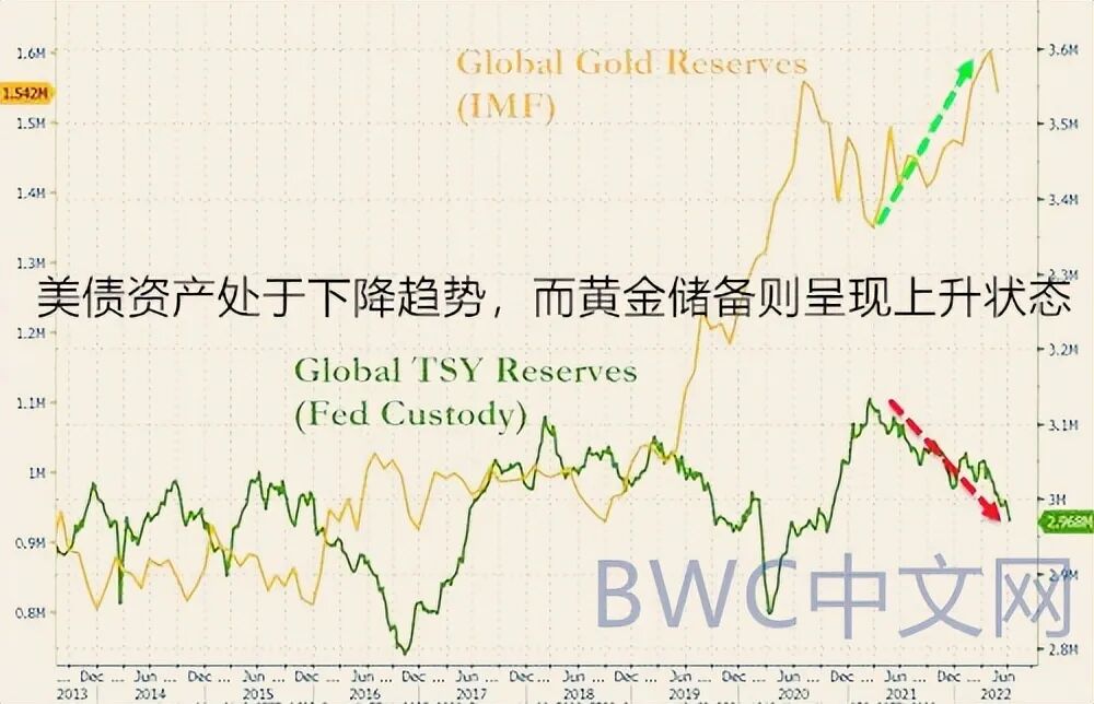 世界银行前首席经济学家认为,美元在不同周期的货币举措正是全球金融风险的根本原因。同时,人们越来越意识到,美元可能在某些时候被拿走,因此,去美债化和抛售美元类资产或已不可逆转。如下图,IMF的报告清晰地向我们展示了,在多国央行的外汇储备中,美债这一美元核心资产处于下降趋势,而黄金储备则呈现上升状态。