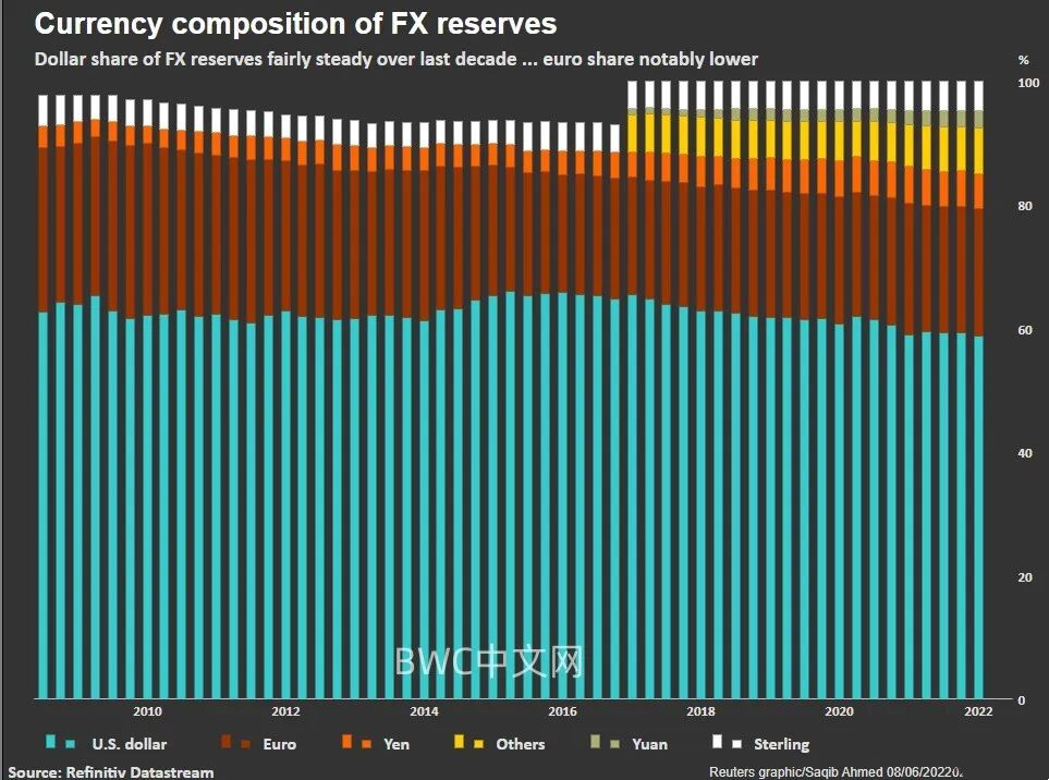 据IMF在7月最新公布的全球外储货币构成(COFER)数据显示,截至3月,美元在国际储备资产中的份额占比已经滑落到25年以来的最低值至58.8%(去年同期为59.43%),延续了二十多年以来的下跌趋势,如果按此趋势,我们很快就会看到这个数字接近50%,而2000年时该比例还高达73%。