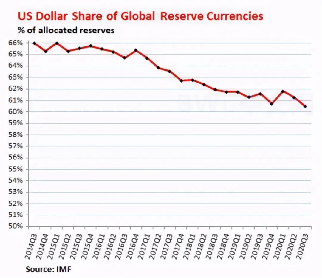 而事情的另一个进展是,美元储备货币份额也正发生实质性下降。据国际货币基金组织的最新数据,截至2020年第三季度,全球央行(美联储除外)持有的以美元计价的外汇储备的全球份额下降至60.5%。这是自1995年以来的最低水平。在过去的六年中,美元所占的份额以每年约1个百分点的速度下降: