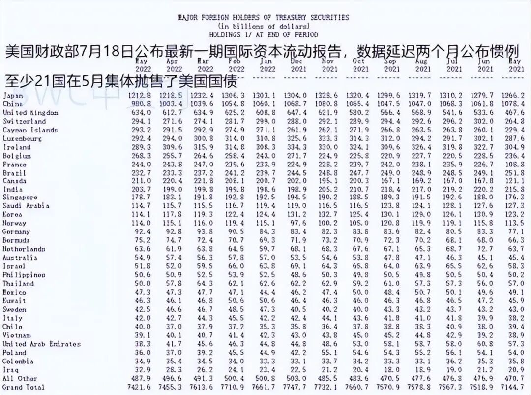 事情的一个新变化是,据美国财政部7月18日公布的最新一期国际资本流动报告(美债数据延后两个月惯例),5月外国货币当局买家抛售341亿美元的美国国债,刷新今年3月所创的2020年3月美国爆发新冠疫情以来最大单月抛售规模。