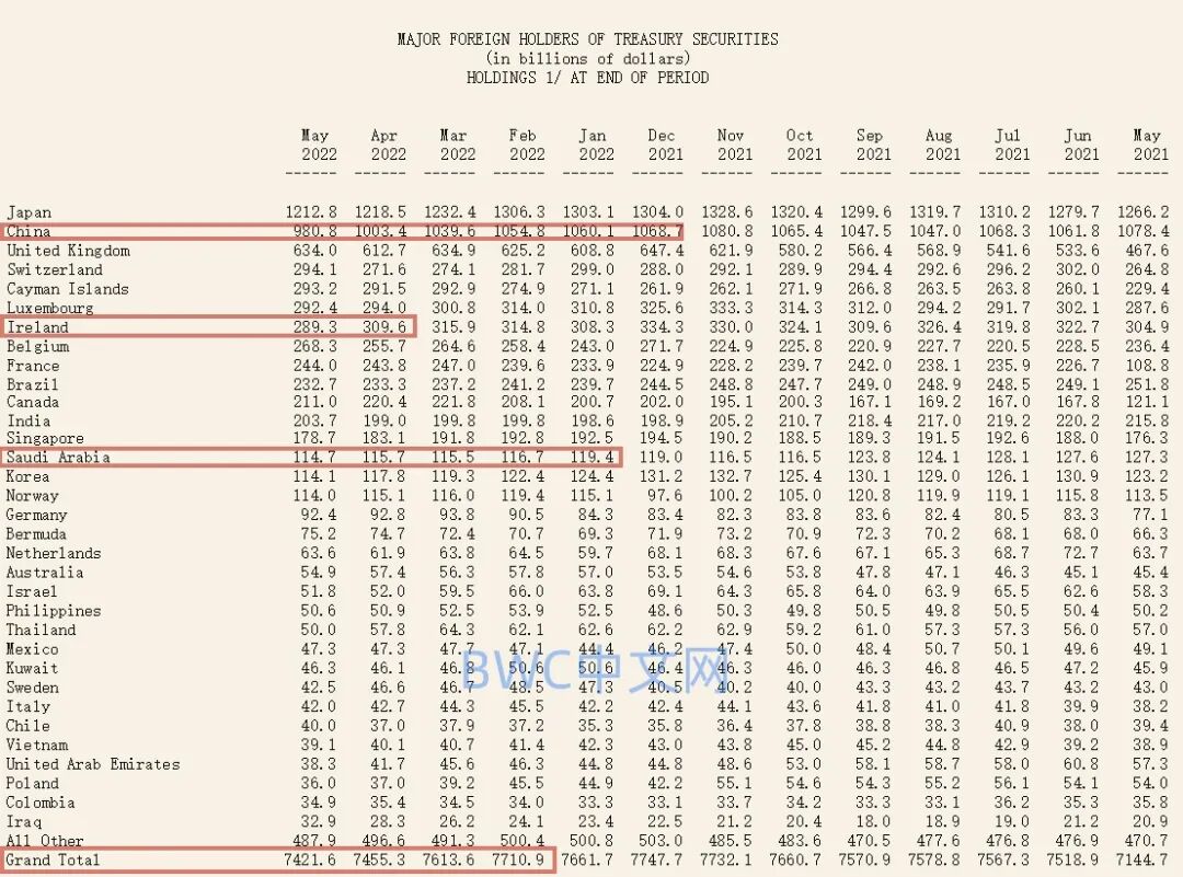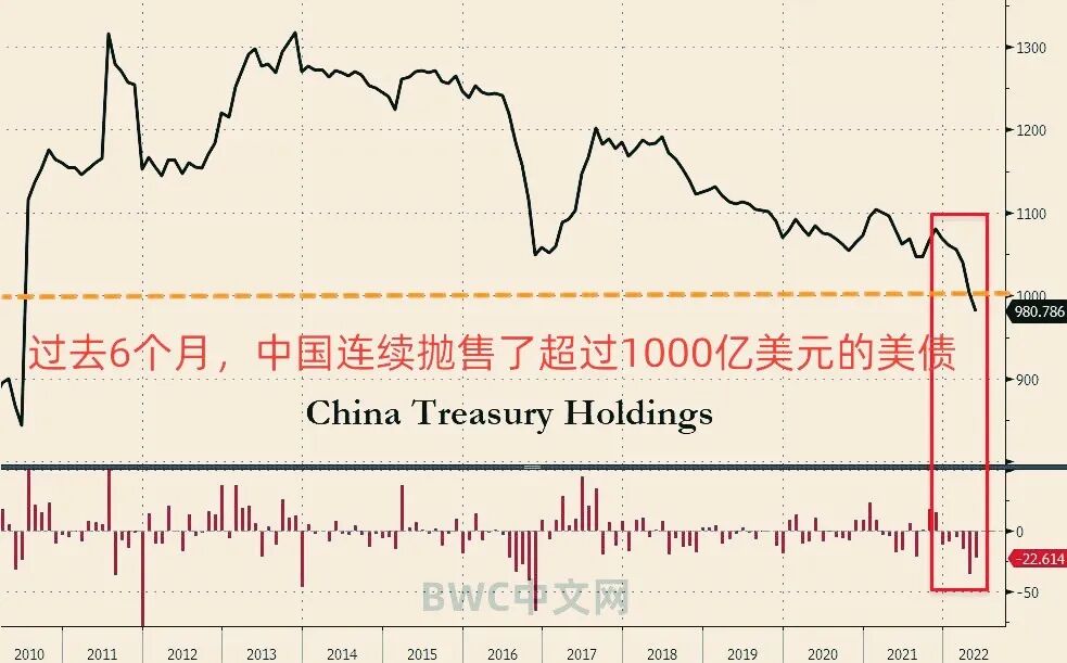 比如,截至5月(美财政部目前只公布到该月),中国连续六个月共减持了1001亿美债(具体数据细节请参考下图),仓位降至十二年以来的最低至不足一万亿,且中国保持了连续两个月抛售美债力度最大的状态,数据显示,从2021年1月至2022年5月的17个月中,中国有12个月均出现不同程度减持美债的状态,另外,最近6个月内,美债海外最大持有者的日本也重手抛售了高达1101亿美元的美债,且这个势头还在继续。