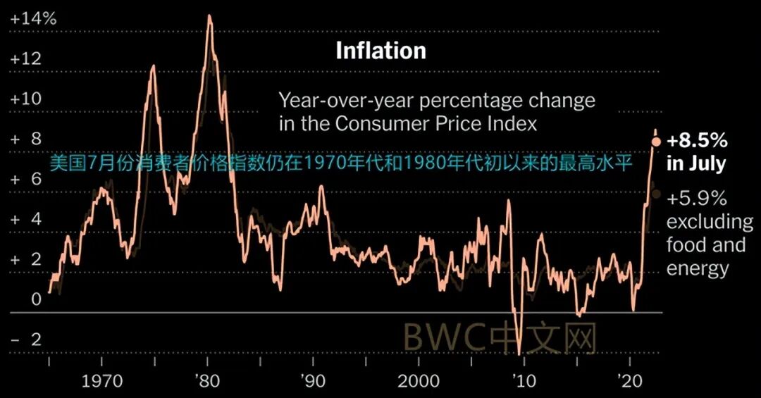 特别是在美联储于2020年大流行之后开启天量美元印钞机,使其在两年间资产负债表堆积至9万亿美元的背景下,尽管已经开始加息缩表,但美国过去几个月的通胀高烧不退。虽然 7月与6月的9.1%相比,略微回落至8.5%,但依然还是保持在上世纪70年代和80年代初的最高水平。显然,今天的美国通胀情况正在接近尼克松当年废除金本位的情形。这对不断丧失美金价值的美元和负债累累的美国经济来说,并不是好兆头。