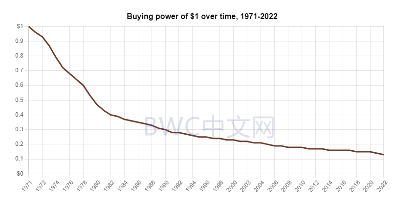 美国单方面宣布废除金本位,彻底将美元与黄金分开。由此也开启了美联储毫无节制炮制膨胀美元的进程。此外,美国经济当时承诺,“以此来平息所谓美元贬值和美国通胀的烦恼,你明日的美元将和今天一样值钱。”但事实证明,这也是一个谎言。根据通胀计算器,如下图,自1971以来,美元已贬值 85% 以上 。当时一美元的购买力在今天不到 14 美分。美媒称,今天的美元越来越像“绿纸”。
