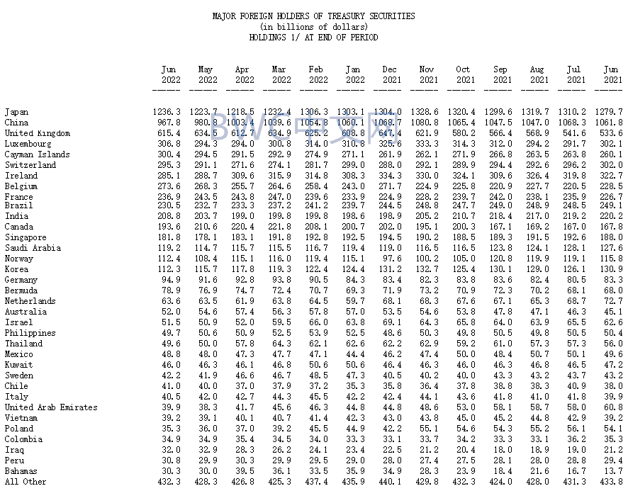 雪上加霜的是,美国国债不断失去大买家。根据美国财政部于美东时间8月15日公布的最新一期国际资本流动报告TIC(该数据延后两个月惯例),全球至少14国在6月集体抛售美国国债。