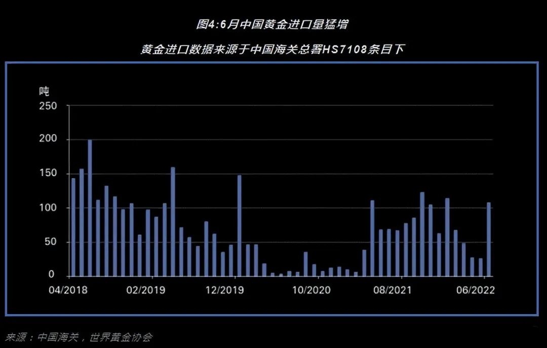 数据还显示,6月,中国黄金进口量也出现猛增,进口黄金107吨,达到五个月以来的最高点,明显高于近三年以来的平均水平,这也使得今年上半年,中国的黄金进口量达到389吨(具体数据细节请参考上图),远高于2021年和2020年的同期水平。