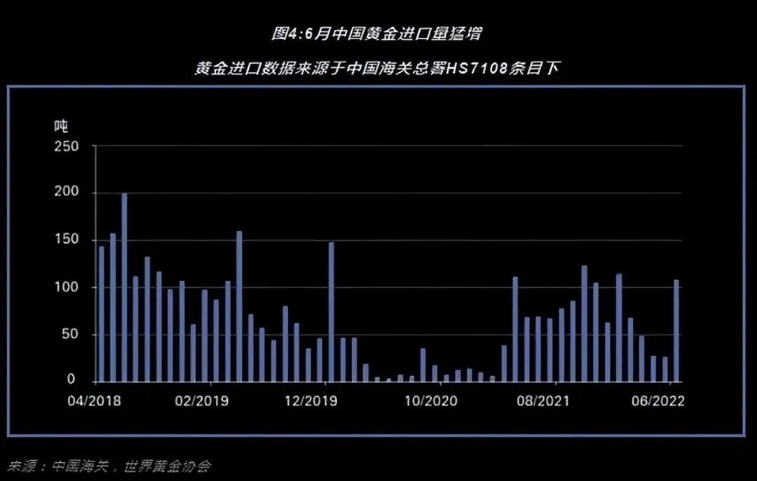 我们还注意到,据中国海关发布的最新数据,中国在今年上半年共进口了389吨黄金。去年的进口量更是高达818吨,比2020年增长了120吨,这也意味着从2022年上半年,仅从官方渠道公布的数据显示就共有389吨黄金已经运抵中国(具体数据请参考下图)。