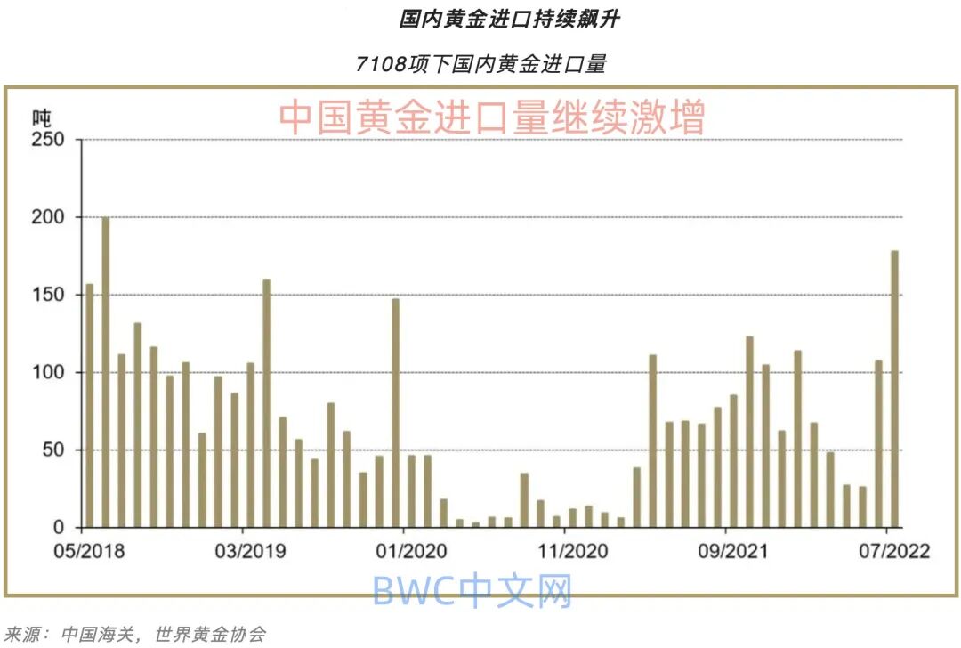 据世界黄金协会援引海关公布的数据显示,7月,中国黄金进口量达178吨,较上月大幅增加71吨,较上年增加111吨,是自2017年以来最高的7月进口量,这也使得今年前七个月,中国的黄金进口量达到567吨,明显高于近三年以来的平均水平,这反映了中国黄金交易近期强劲的黄金需求,2021年的黄金进口量为818吨,比2020全年的601吨增长36%。