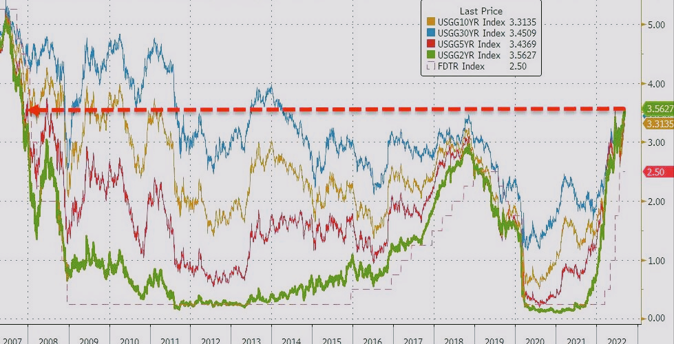 作为利率预期风向标的两年期美债收益率在22日飙升至4.17%,接近2007年11月以来的最高水平,因为市场重新调整了对美联储将如何积极加息以努力抑制通货膨胀的利率预期。