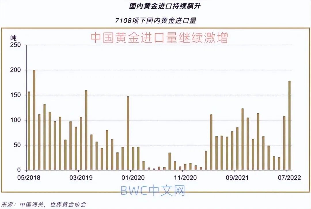 但是,世界黄金协会援引海关公布的数据显示,7月,中国黄金进口量达178吨,较6月大幅增加71吨,这也是自2017年以来最高的同期进口量,这也使得2022年前七个月,黄金进口总量达到567吨,明显高于近三年以来的平均水平(具体细节请参考下图),这反映了中国黄金交易近期强劲的黄金需求,2021年的黄金进口量为818吨,比2020全年的601吨增长36%。