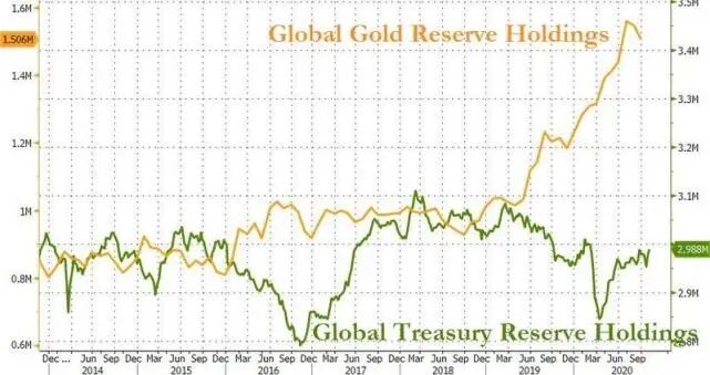 再比如,据美国最新公布的国际资本流动报告显示,截止9月份,外国债权人已经在过去的26个月内净减少了创纪录的1.12万亿美债,另据世界黄金协会最新数据,全球央行的购金活动在今年前10个月依然活跃,而2019年全球央行的黄金净购买量已经增长650.3吨较2017年增幅达到74%,创下了1971年美元与黄金挂钩以来的最高纪录。