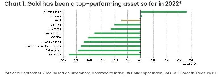 世界黄金协会在9月27日发表的报告中指出,尽管黄金受到地区冲突和通胀的支持,但美国利率上升和强势美元对黄金的表现产生了明显的负面影响,黄金仍是2022年表现较好的资产类别之一。