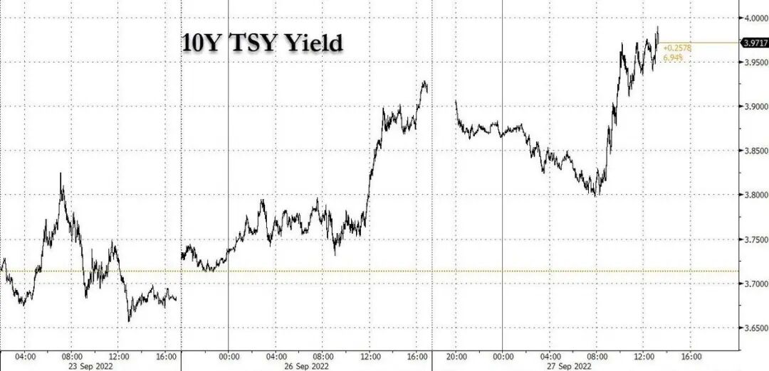 美银全球研究部在9月28日表示,“美债的亏损率可能是自1949年以来最大的一年,遭受了数十年以来最严重的抛售潮”,所有的美国债券收益率都在飙升,将美债价格推至15年以来最低,10年期接近3.9%,2年期收益率超过4.3%。