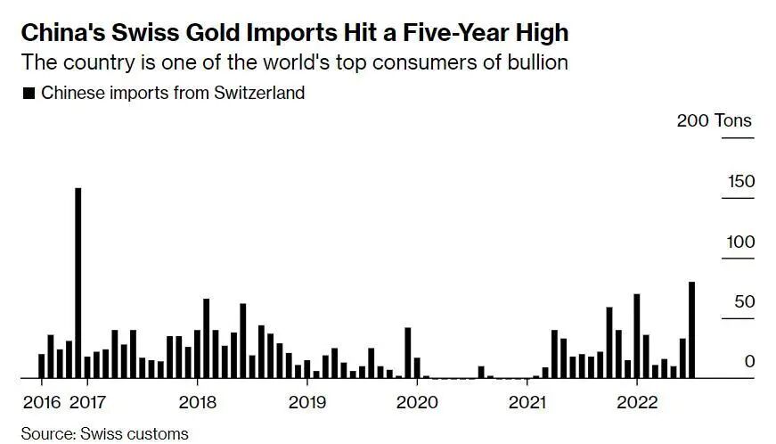 紧接着,据美国媒体的进一步报道称,据世界黄金协会9月28日公布的数据,7月份,瑞士海关对中国的黄金出口按月增长意外的飙升147%,且为2016年以来最多,其中还约有230吨黄金已经在9月从欧美运抵中国,这也使得2022年至今,瑞士黄金出口量跃升至930吨,创下2018年以来的最高水平,这表明,中国对黄金的需求正在回升。