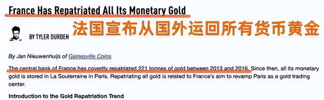 美国金融网站ZeroHedge在9月18日披露的文件称,法国央行已经从国外遣返回了所有货币黄金,这些黄金数量占到法国黄金储备的9%,我们查询法国银行网站上最新公布的信息得知,法国在2013年至2016年的某个时间内遣返221吨,这些从国外运回来的所有的黄金目前都存放在巴黎金库中,这也是我们能查询到目前全球央行从国外遣返黄金回国的最新报道。