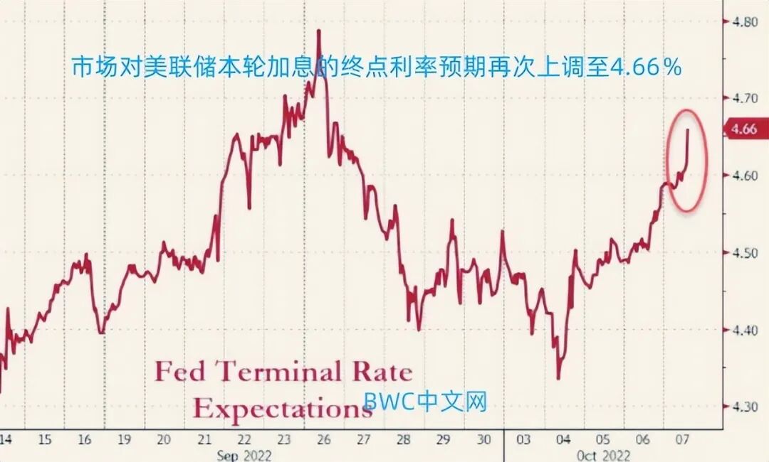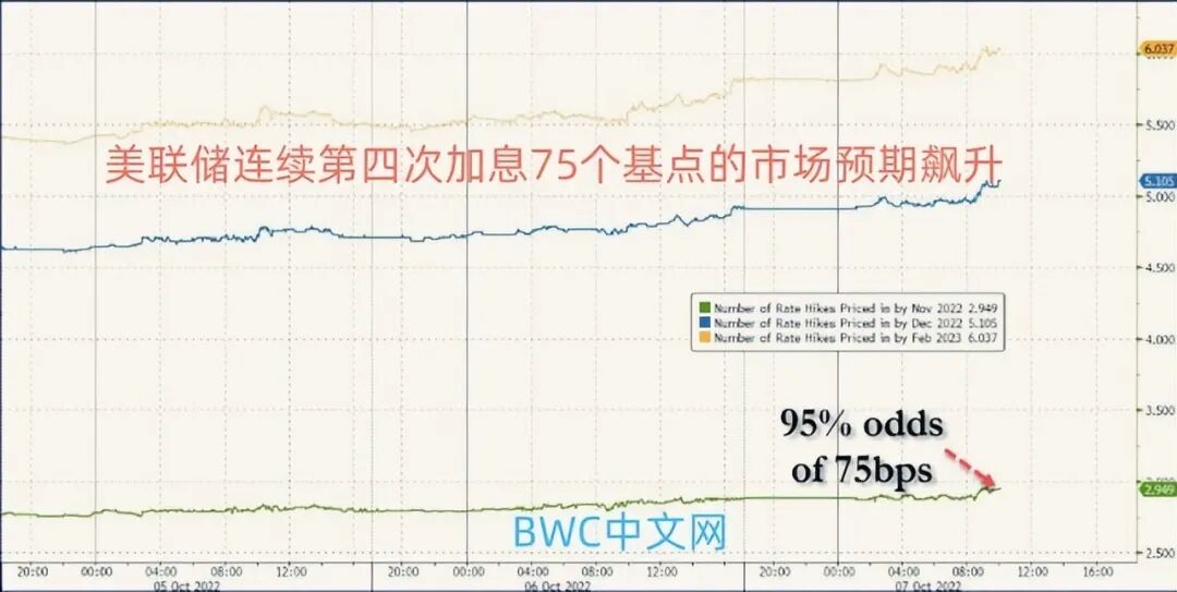 10月8日的联邦基金利率显示,11月连续第四次加息75个基点的概率为95%,基本板上钉钉,高于报告公布之前的85.5%,特别是考虑到市场预计10月13日公布的CPI数据将再次攀升。