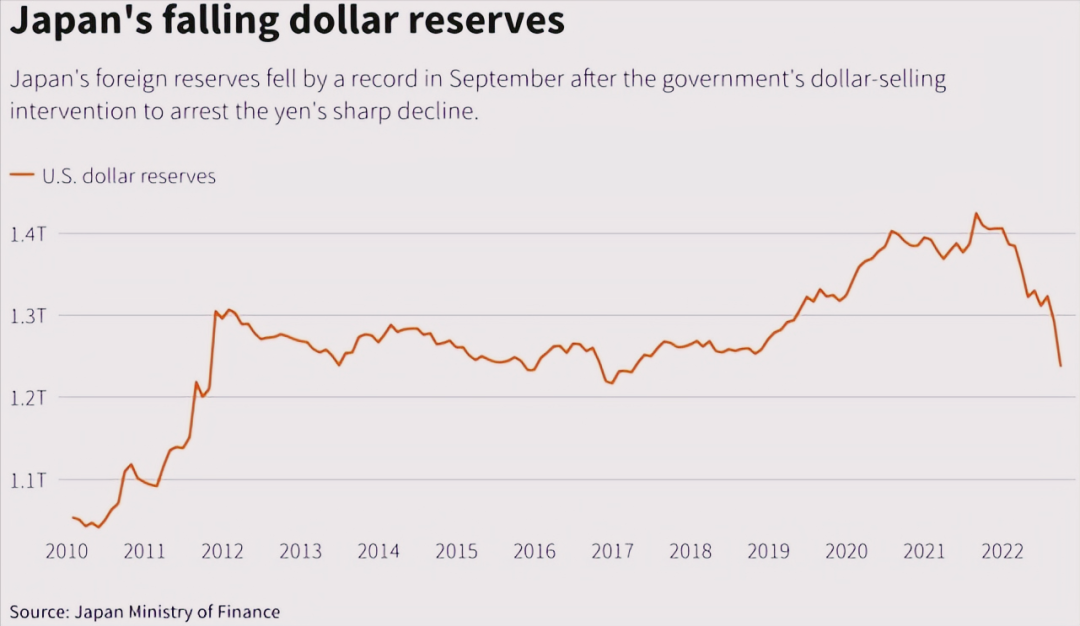 据日本财务省10月7日公布的数据显示,日本抛售美债外储资产支撑日元的力度非常猛烈,使得日本9月份外储环比下降,下降幅度创下该国外储有纪录以来最大,数据显示,仅日本当局在9月22日和10月2日这两次在外汇市场的干预规模可能达到5.8万亿日元(405亿美元)干预外汇市场以支撑日元,消耗了近15%的资金,创历史新高。