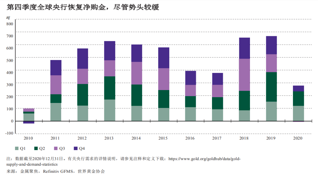 报告数据显示,在过去一年中,全球央行的买家的数量仍多于卖家,几个新兴市场国家央行为主要买家,且黄金占其外汇储备的比例较低,因全球经济的高不确定性、主要国家宽松货币政策、极低的利率,黄金作为避险资产的价格动力、美元贬值以及对出现更高通胀的担忧共同推动了创纪录的资金流入黄金支持的ETF达3780吨,黄金为全球央行稳定市场及货币提供了额外助力。