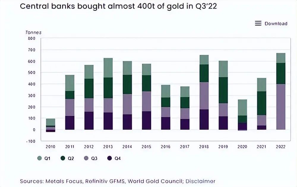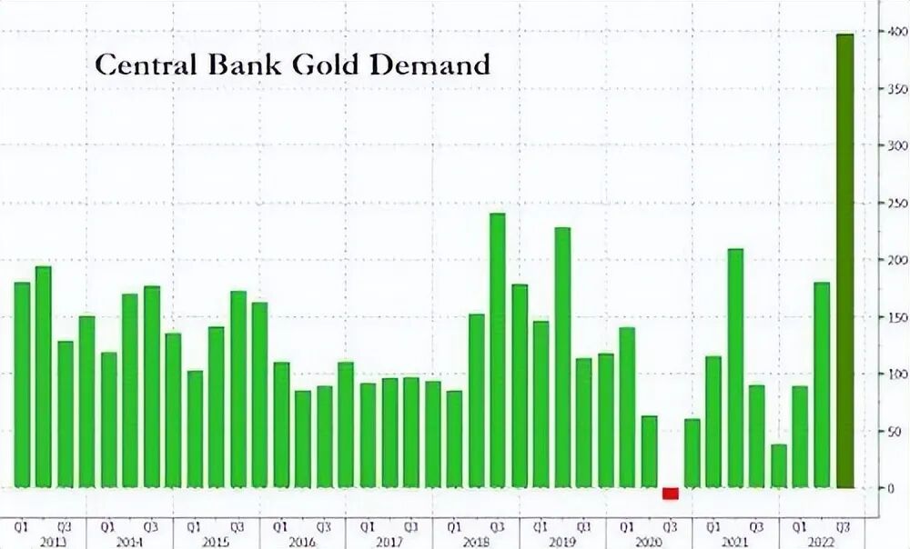 事情的最新进展是,根据世界黄金协会 (WGC) 11月公布的最新数据,全球的央行正以 55 年来最快的速度购买黄金。在三季度购买了创纪录的 399 吨黄金,全球对贵金属的需求回到了大流行前的水平。世界黄金协会同时表示,珠宝商和金条以及金币买家的零售需求也很强劲。