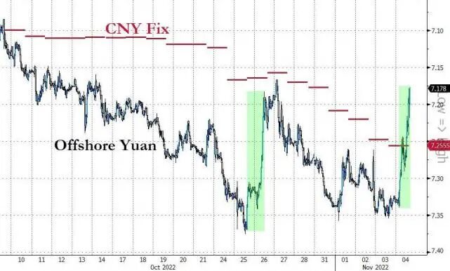 11月4日,在岸人民币和离岸人民币大反攻,均大涨超千点,离岸人民币兑美元日内飙升超1500点,一度上涨超过2%,收报7.1720,这是自2010年8月首次交易以来的最大单日涨幅,在岸人民币兑美元日内涨超1300点,涨幅高达1.7%,收报7.183,与此同时,美元指数创下七年来最大单日跌幅,下跌1.9%至110.77。