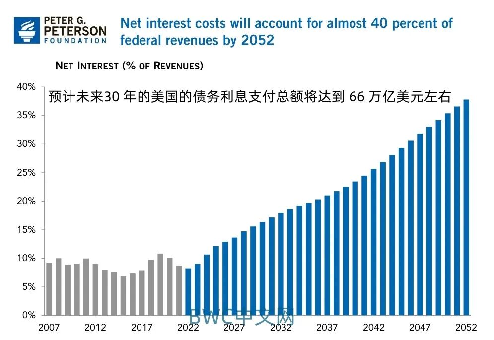 而根据美国国会国会预算办公室 (CBO) 预计,从长远来看,利息成本的增长为美国的国家债务带来了重大挑战。预测未来 30 年的美国的债务利息支付总额将达到 66 万亿美元左右,到 2052 年将占联邦总收入的近 40%。利息成本也将成为未来几十年最大的支出,将于2029 年超过美国的国防开支,于2046年超过美国的医疗保险,于2049年超过美国的社会保障。