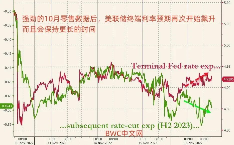 同时,美国在11月17日最新公布的10月零售销售超预期增长,无情地向几位美联储理事暂停加息等鸽派转向泼冷水,更是向市场发出了美联储将进一步会采取激进加息以打击通胀的信号,所有这些都提高了终端利率预期,以及更高的经济衰退后降息预期,值得注意的是,高盛将其终端利率预测上调至5.52%,料将给美债带来更大的抛压。