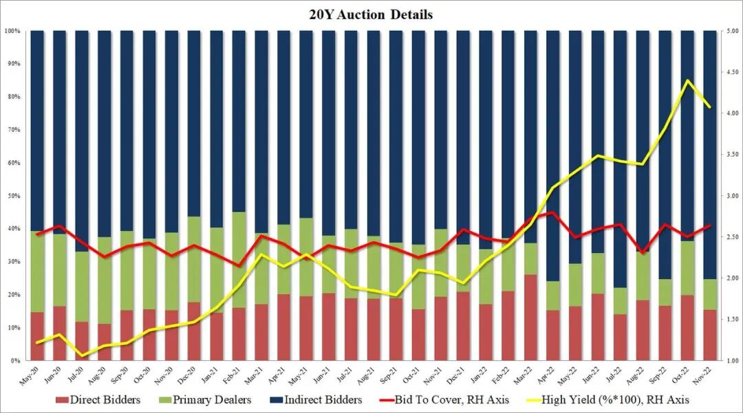 比如,据美联储在11月15公布的数据显示,截至11月10日的四周内,全球央行抛售了总额达980亿美债,且为2020年3月以来最大月度抛售规模,这也使得美国财政部在11月17日举行的320亿美元20年期美债拍卖创下历史纪录的惨淡交易数据。