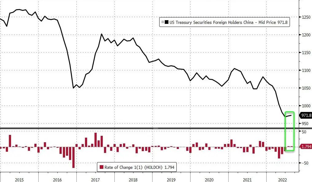 而在2021年12月至2022年6月,中国曾连续七个月共抛售了1130亿美债,目前中国仍为第二大海外美债债主,美债持仓继续创下自2010年5月的8437亿美元以来的最低水平至9336亿美元,中国所持美债仓位在今年5月首次降至万亿美元。