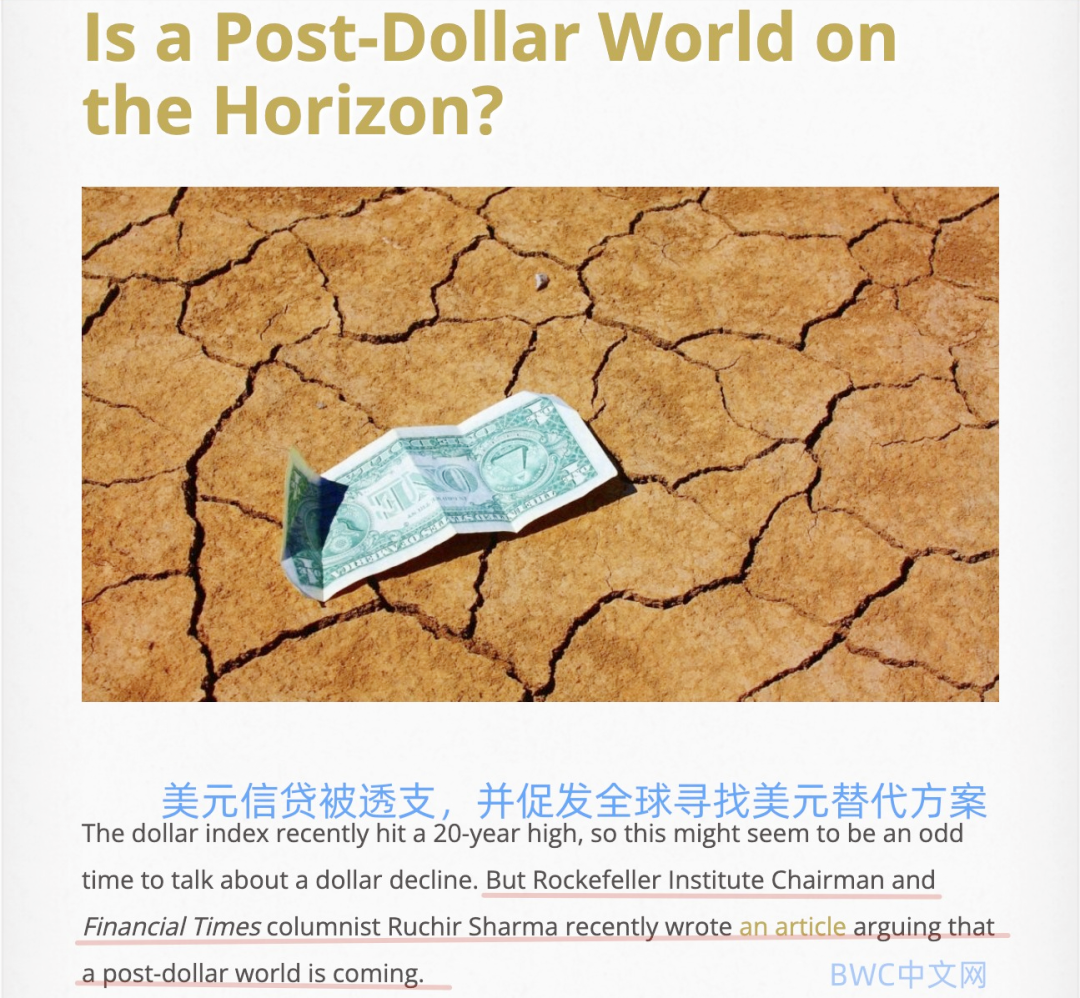 IMF在12月4日最新发布的报告称,截至2022年11月,全球有124个货币当局正在研究或已经推出数字货币(CBDC),因为,美元指数的剧烈波动将再次呼吁从以美元为中心的全球金融体系转变,而数字货币不仅可以提高货币流动的透明度,还有助于减少美元的储备(当一个国家在外币之外使用或代替本国货币时),这也是BWC中文网微信公众号财经团队在不同场合所强调的观点。