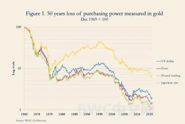 然而,1971年尼克松单方面宣布废除了金本位,将美元与黄金进行了脱钩。也正是从那时开始,伴随美联储的几次大规模QE印钞周期,美元,欧洲主要货币等与黄金对比的购买力都在不断下降。美元,欧元等货币都在不断走向失去理智和价值的绝境边缘。
