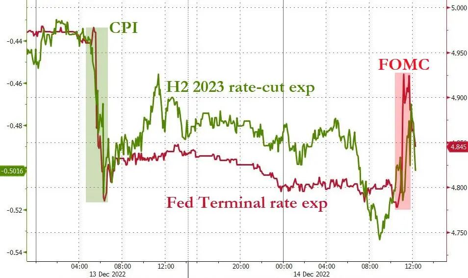 所以,接下去随着美联储持续加息后将美国经济拖入衰退通道后,华尔街正在押注美联储或会在明年第四季度开始降息(请参考下图),这又会反过来刺激通胀再次开始飙升,从而使得美国经济陷入滞胀。