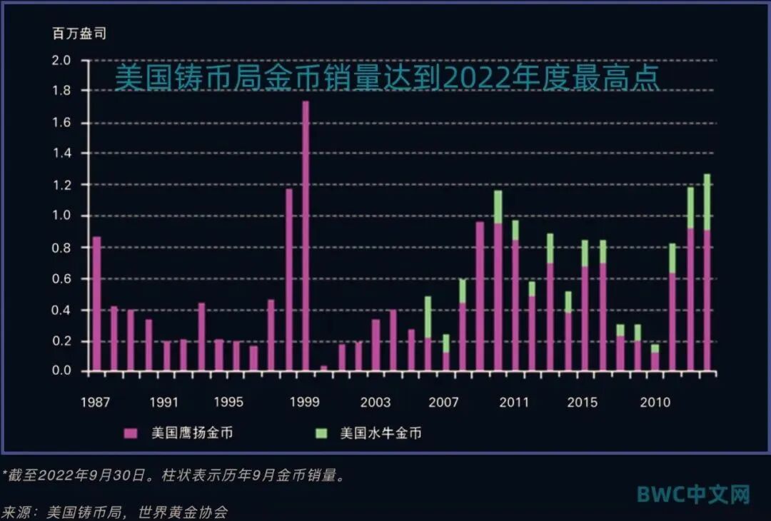 据美国铸币局12月20日公布的数据显示,截至12月18日的一周内,美国鹰金币销售高达28万盎司,按周环比增长21%,继续保持强劲需求,这也使得2022年美国鹰金币销售高达152.1万盎司,甚至,今年仅用了不到10个月就接近于2020全年的销售额,出乎全球市场投资者的意外。