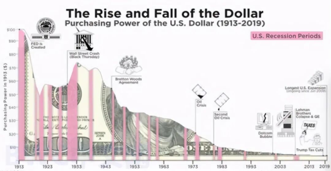 不仅于此,美联储自1913年成立以来,美元几乎持续呈现出购买力下降的趋势,如下图。
