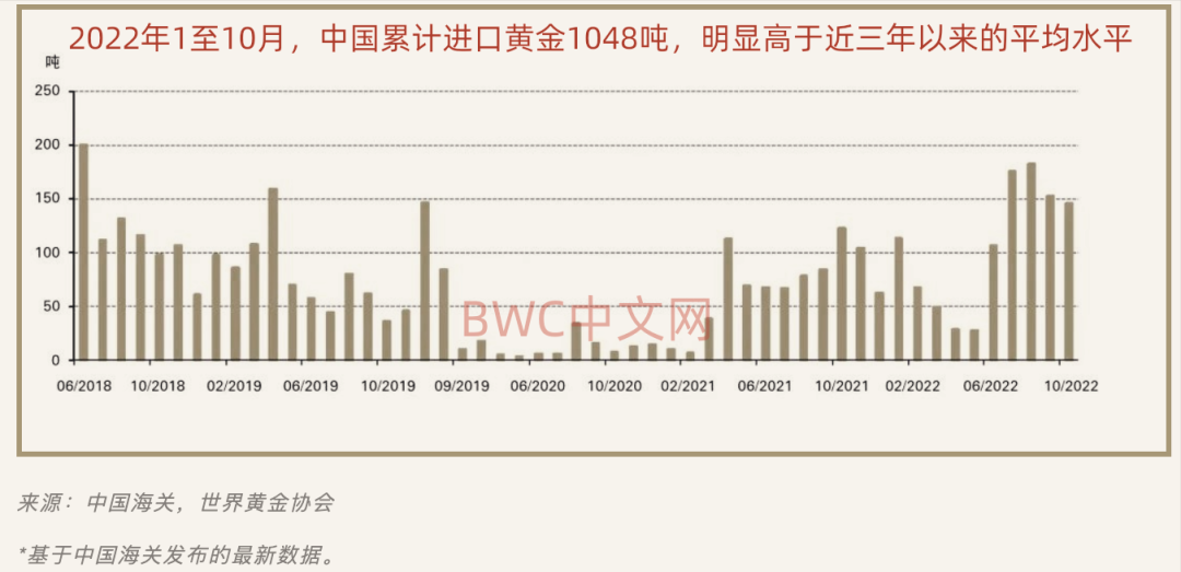 世界黄金协会在12月18日公布的数据显示,2022年前10个月,中国的黄金进口总量高达1048吨,高于近三年以来的平均水平,其中,2019年为986吨,2020年和2021年分别为217吨和821吨,这表明自2022年1月以来,至少有1048吨黄金已经运抵中国(具体数据细节请参考下图)。但事情到此并没有结束,现在有个新消息更让投资者感到意外。