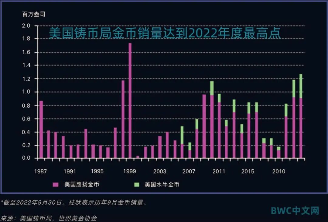 据美国铸币局在1月2日公布的数据,2022年,美国金币(Gold Eagle)总销量为189.2万盎司,较同期增长25.1%,具体请参考下图美国人购买金币的部分数据细节。