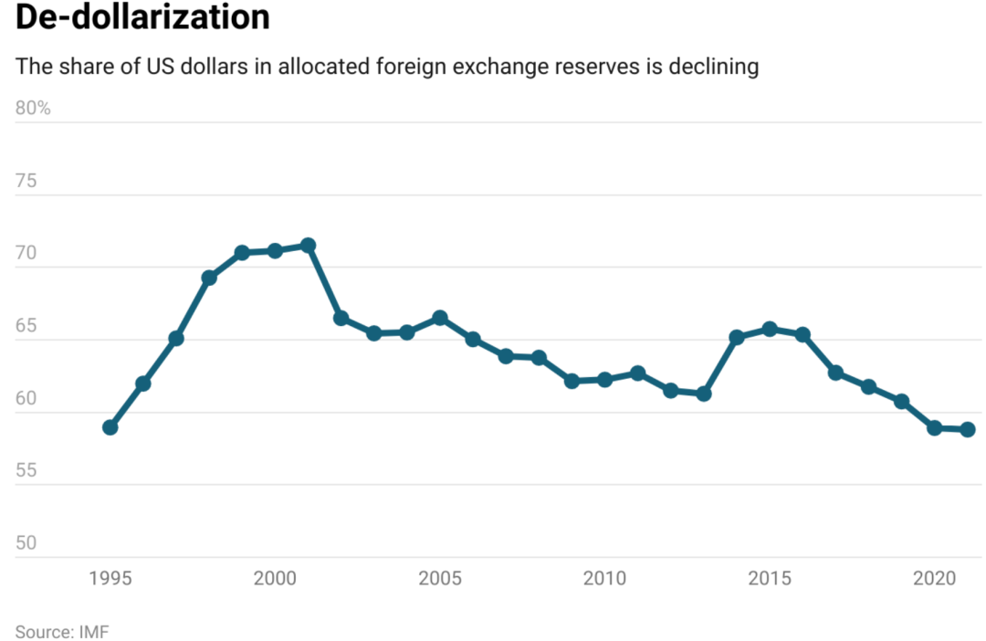 高盛分析师扎克潘克斯在1月3日更新发表的最新报告中认为,美国利用松紧美元指数周期来收割全球市场和把美元当作制裁工具,会让美元地位和使用份额继续下降(具体数据请参考IMF为我们提供的图表)。