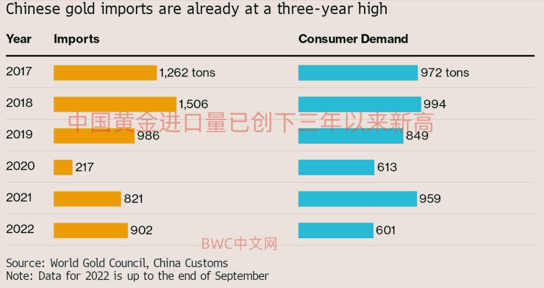 而我们据瑞士海关在12月15日公布的数据,截至11月,瑞士海关对中国的黄金出口也创下2017年以来的创纪录新高,按月增长意外飙升近150%,这也使得2022年至今,瑞士黄金出口量跃升至1090吨,而来自中国市场的需求是主要推动力(具体数据细节请参考下图),另外,约有180吨黄金也已经在11月份从欧美运抵中国市场。