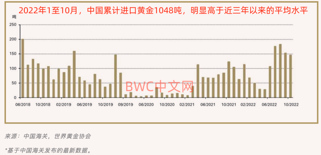 另外,据世界黄金协会(WGC)在12月18日公布的最新数据汇总,中国10月份进口黄金总量为146吨,较9月下降6吨,较去年同期增加23吨,这说明中国的黄金进口量依旧保持高位(具体细节请参考下图),这也使得2022年1至10月,中国累计进口黄金高达1048吨,明显高于近三年以来的平均水平,其中,2019年为986吨,2020年和2021年分别为217吨和821吨。