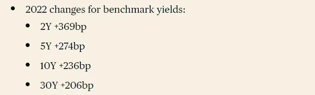根据Refinitiv最新公布的统计数据,美国10年期国债收益率在2022年累计上涨了约236个基点,这是至少自1953年以来的最大年度涨幅。2年期美债收益率全年涨幅更是高达369个基点,5年期和30年期收益率的年度涨幅也分别达到了274个基点和206个基点。美债收益率与价格和持有情况成反比,这些涨幅说明,美债抛售潮猛烈。