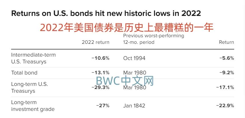 过去一年间,围绕美国债务上限的风险不断扰乱市场。对长短期美国国债都带来了严重冲击。投资历史学家、圣克拉拉大学名誉教授爱德华·麦夸里 (Edward McQuarrie) 表示,2022 年是美国债券有史以来最糟糕的一年。美国债券在 2022 年遭受了严重的崩溃。