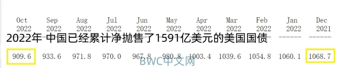 与此同时,根据美国财政部于2022年12月下旬公布的最新一期国际资本流动报告(该数据延后两个月惯例),截至2022年10月,中国已经在10个月间累计净抛售了1591亿美元的美国国债,累计净抛售比例约15%。由2021年12月的1.0687万亿美元降至2022年10月的9096亿美元。并且已经连续6个月持有美债规模低于1万亿美元。