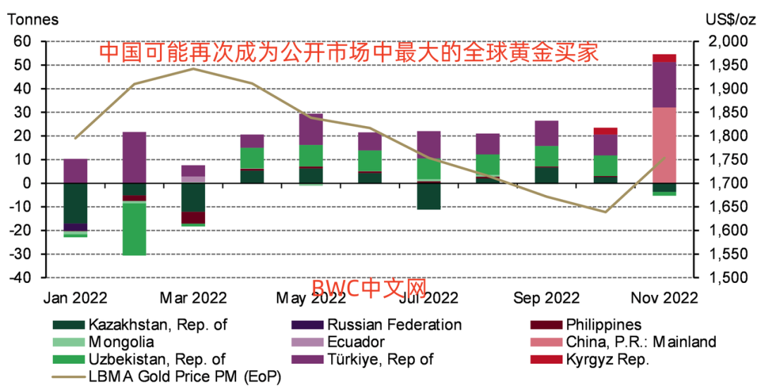 根据世界黄金协会在1月8日公布的数据,全球央行在2022年12月净购买了50吨黄金,比去年同期增加了47%,在这一净总量中,三个国家央行的总购买量为55吨,而哈萨克斯坦和乌兹别克斯坦是最大的卖家,贡献了5吨的总销售量,土耳其和吉尔吉斯则分别购买了19吨和3吨,中国央行在1月7日公布的数据显示,截至去年12月底,黄金储备在11月增持32吨的基础上又增加了30吨,这使得中国的黄金储备总量大幅升至2010吨。