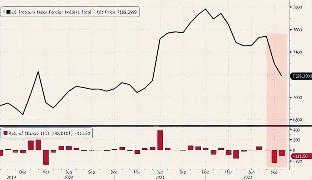 根据美国财政部2022年12月下旬公布的最新一期国际资本流动报告显示(该数据延后两个月惯例),截至2022年10月,美国国债的海外总持有量(按主要国家分类)持续呈现暴跌的状态,总持仓暴跌至 7.185 万亿美元,达到2021 年 5 月以来的最低水平。