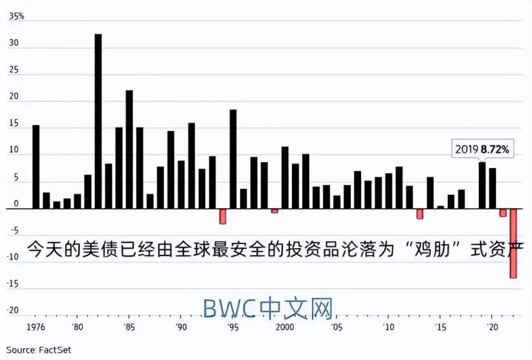 与此同时,我们也注意到,伴随全球多国不断扩大非美元货币的各种使用,美债这一美元核心资产正在发生历史性的崩溃。在过去一年间,彭博美国债券综合指数下跌了13%,轻松超过了上世纪70年代以来的所有年度跌幅纪录。此前美债糟糕的年度为1994年,但当时的该指数跌幅也不过2.9%。显然,今天的美债已经由全球最安全的投资品沦落为“鸡肋”式的资产了。