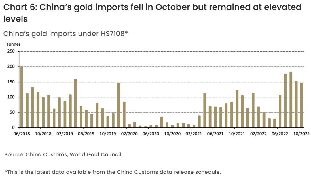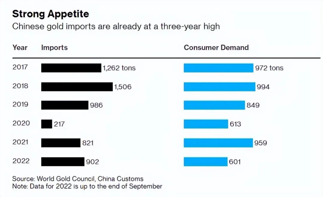 世界黄金协会援引海关最新公布的数据显示,2022年10月,中国黄金进口量持续保持高位,进口了146吨,这也使得2022年前10个月,共进口了1048吨黄金,其中第三季度共进口黄金512吨,明显高于2019年以来的平均季度水平,其中,2019年为986吨,2020年和2021年分别为217吨和821吨。