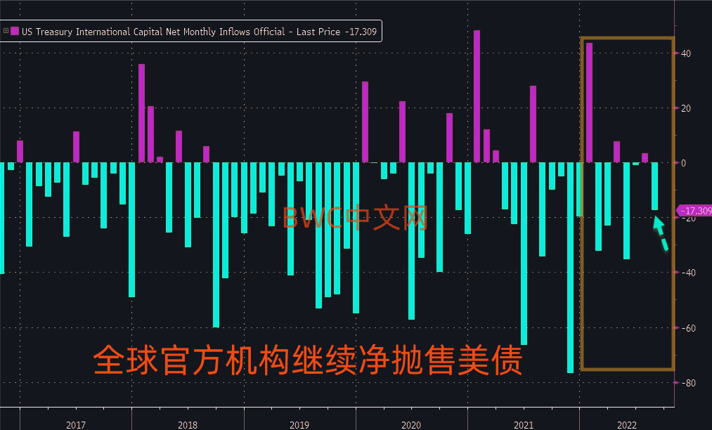 这个趋势我们在美国财政部历次公布的国际资本流动报告的数据汇总图表中找到了逻辑,数据显示,自2017年10月以来,全球央行共有49个月都呈现出净抛售美债的状态,这与他们的黄金储备增长形成鲜明的反差。