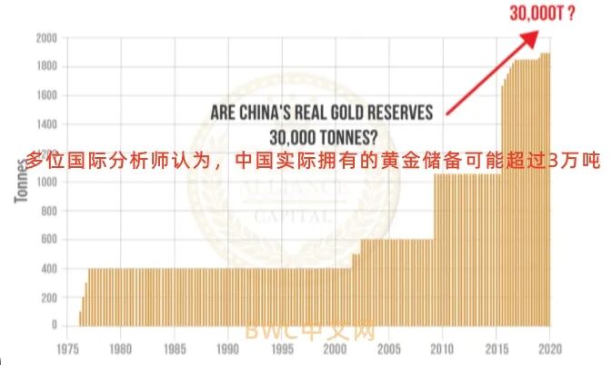 据国家外汇管理局公布的数据,中国在去年11月和12月连续两个月增加黄金储备,共增持约62吨黄金,至2010吨。而在此之前,自2019年以来,曾连续38个月保持1980吨黄金储备持平。此外,通过下图,可以看到,包括国际黄金分析第一人阿拉斯戴尔.麦克劳德等多方分析认为,中国实际拥有的黄金储备可能超过3万吨。