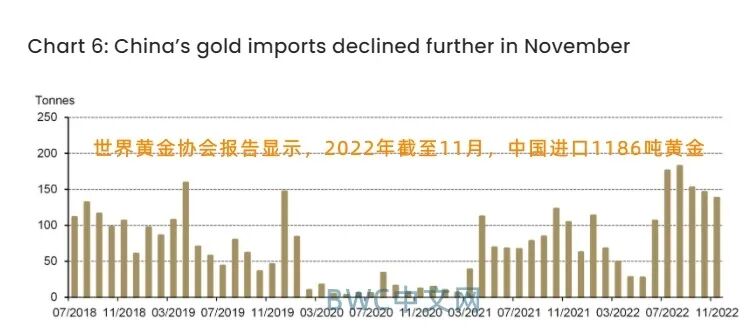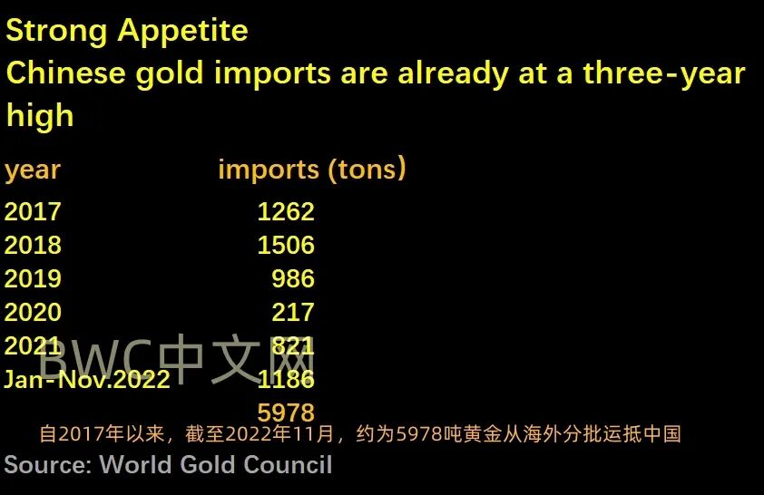不仅于此,世界黄金协会1月16日公布的报告显示,中国在2022年10月和11月共进口284吨黄金。而前三季度进口黄金为902吨,也就是说,2022年截至11月,1186吨黄金已经从海外运抵中国。